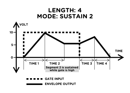 - Mode Selector Sets the envelope behaviour when a gate is present. Full runs from start to finish; Loop loops over active segments; Sus 1 to Sus 8 sustains at the end of the chosen segment.