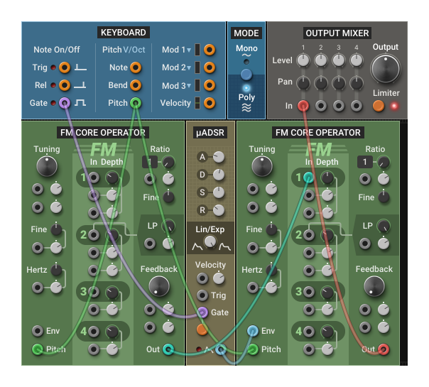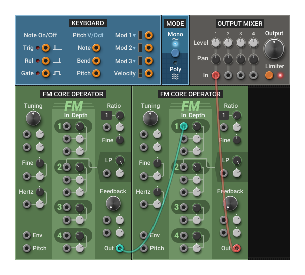 Building a digital FM patch requires at least two FM Core Operator modules, with the output of the first connected to the second.