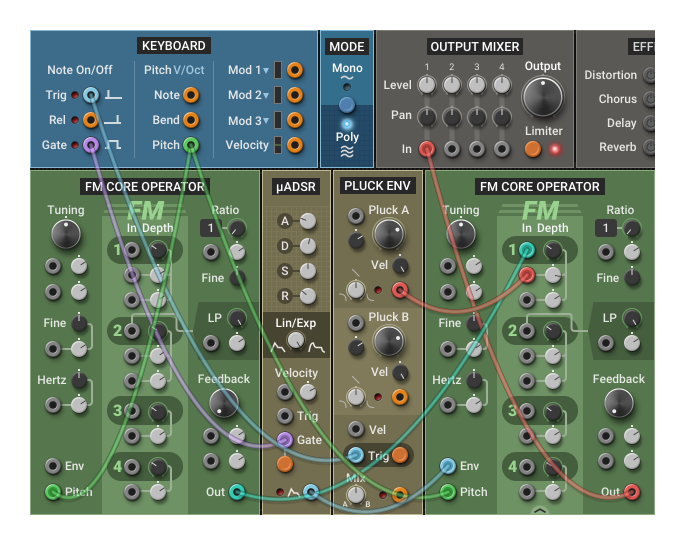- For a simple synth-like vibrato, connect the LFO to all FM Core Operator modules and use the same modulation depth.