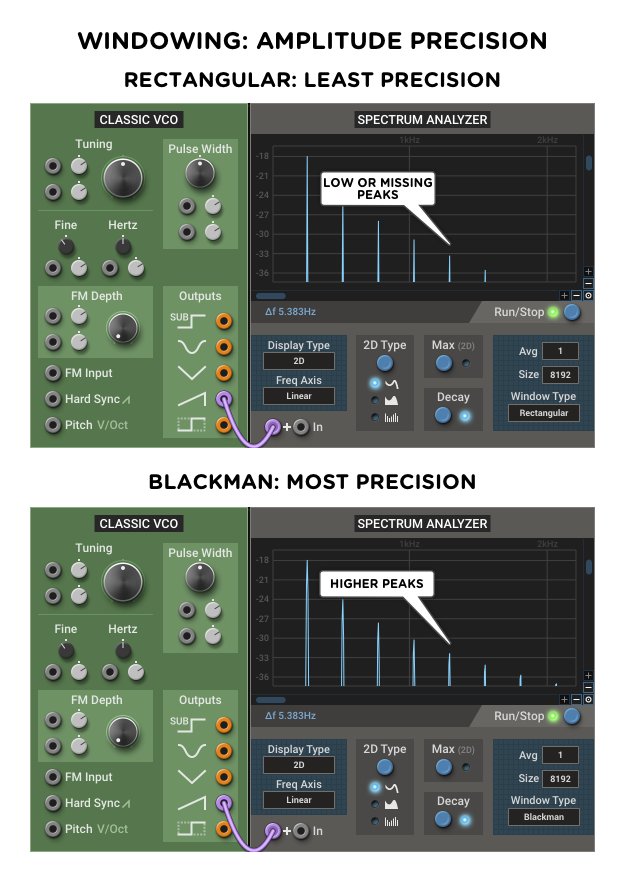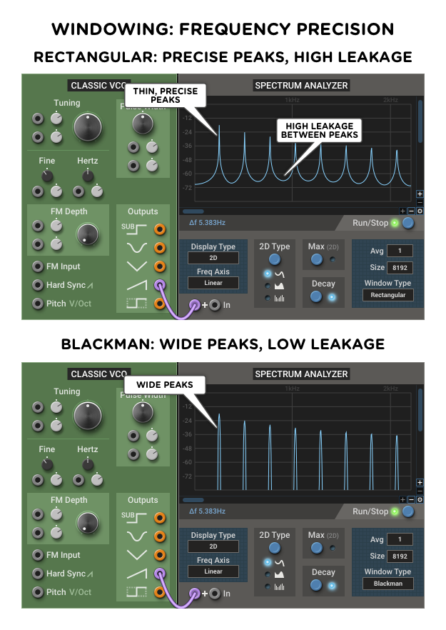 Since an image is worth a thousand words, let’s take a look at how the two opposite window types—rectangular and blackman—handle showing the spectrum of a sawtooth wave.