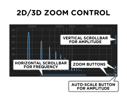 In 2D and 3D mode, the vertical scrollbar and zoom buttons control the amplitude and the horizontal scrollbar and zoom buttons control the frequency range.