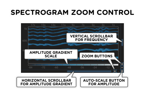 In Spectrogram mode, the vertical scrollbar and zoom buttons control the frequency range, and the horizontal scrollbar and zoom buttons adjust the amplitude gradient.